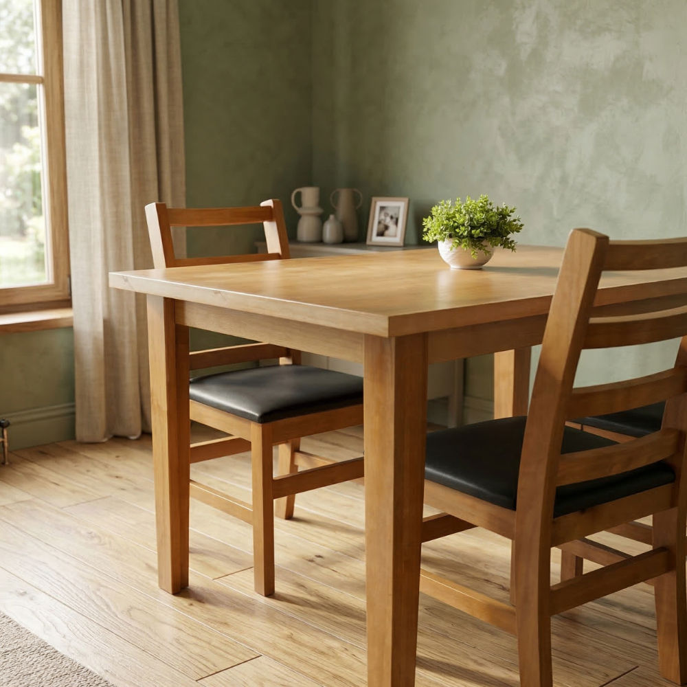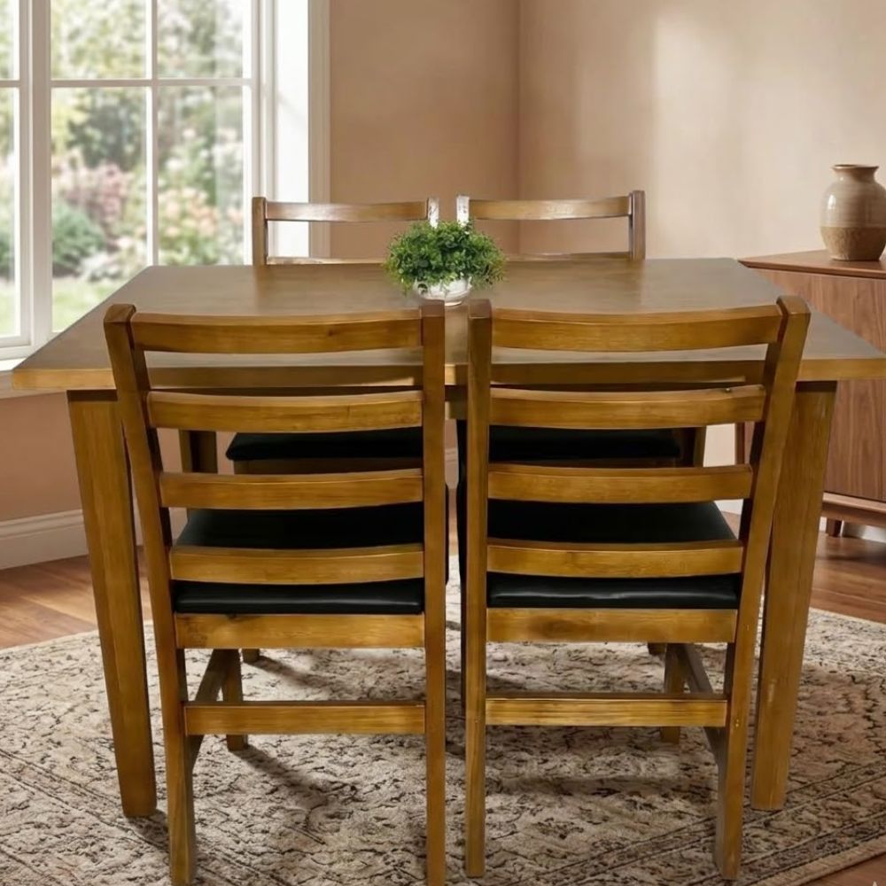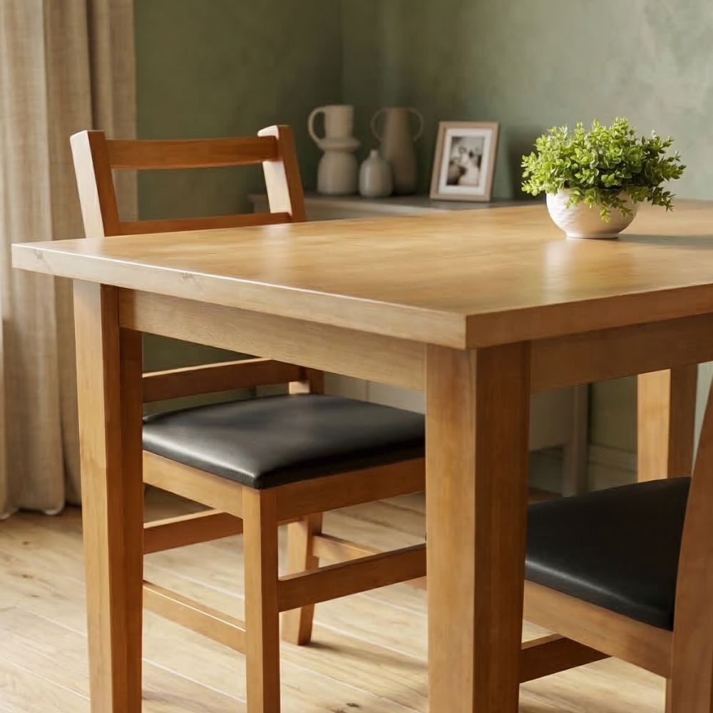 Desenvolvido para o uso frequente, o conjunto combina estrutura sólida, materiais resistentes e praticidade no uso. A mesa oferece estabilidade durante as refeições, enquanto as cadeiras estofadas garantem conforto e facilidade de manutenção. O acabamento em verniz reforça a proteção da madeira e contribui para a conservação das peças ao longo do tempo.