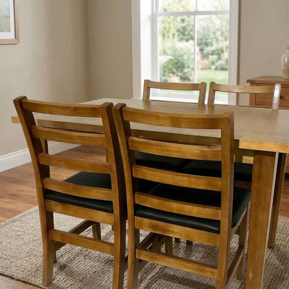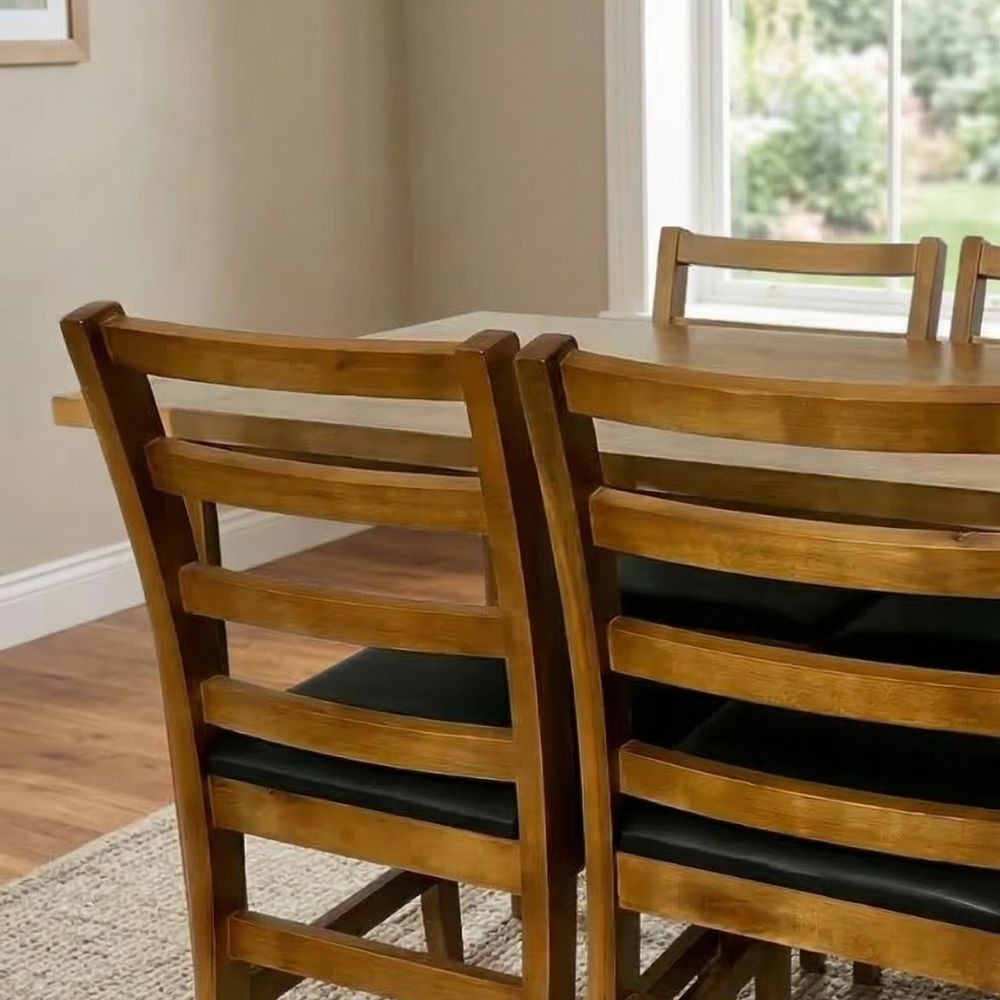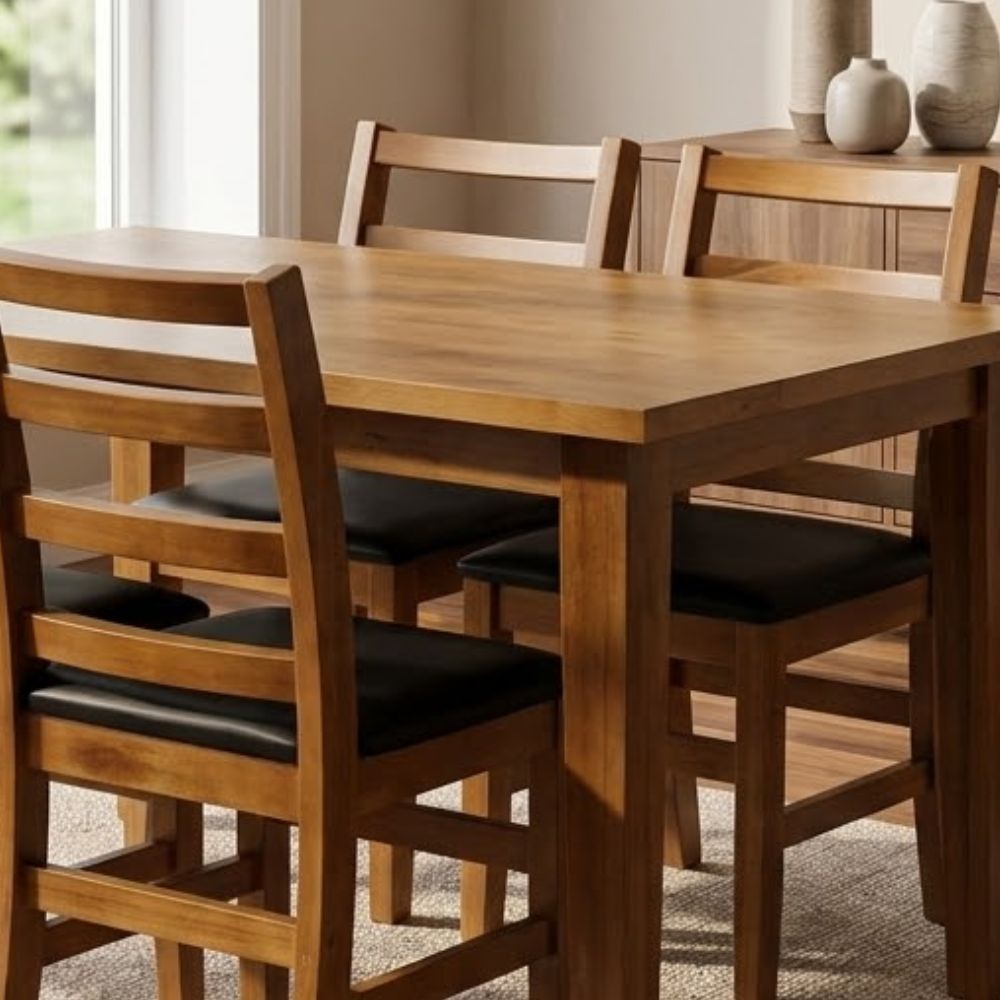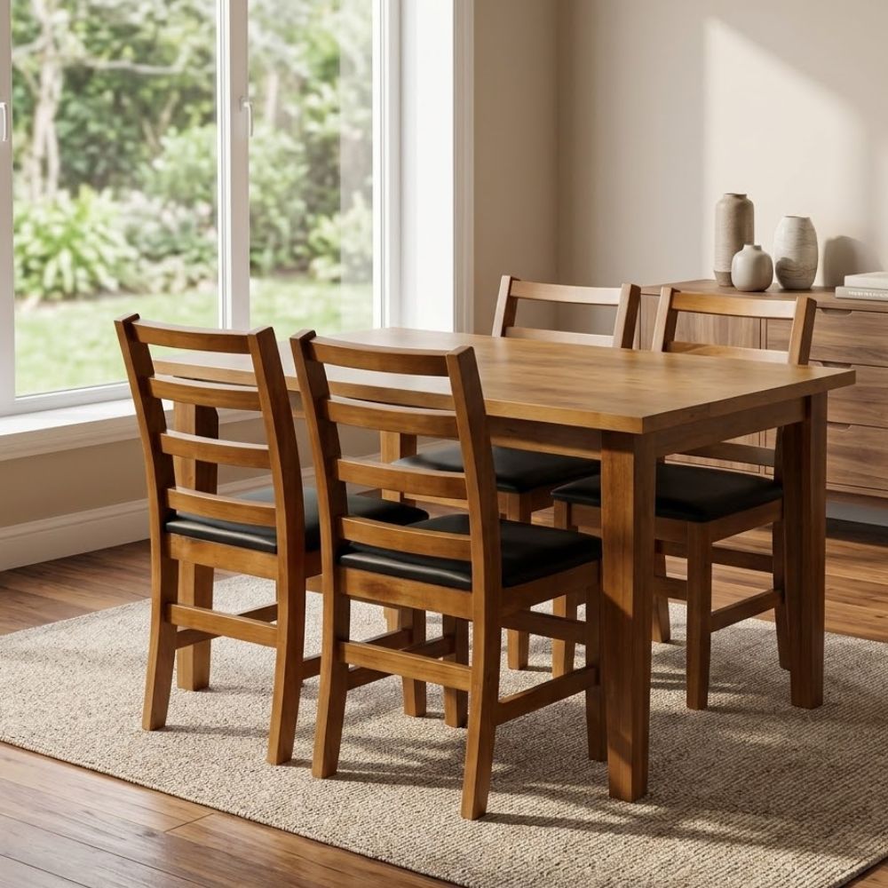 Desenvolvido para o uso frequente, o conjunto combina estrutura sólida, materiais resistentes e praticidade no uso. A mesa oferece estabilidade durante as refeições, enquanto as cadeiras estofadas garantem conforto e facilidade de manutenção. O acabamento em verniz reforça a proteção da madeira e contribui para a conservação das peças ao longo do tempo.