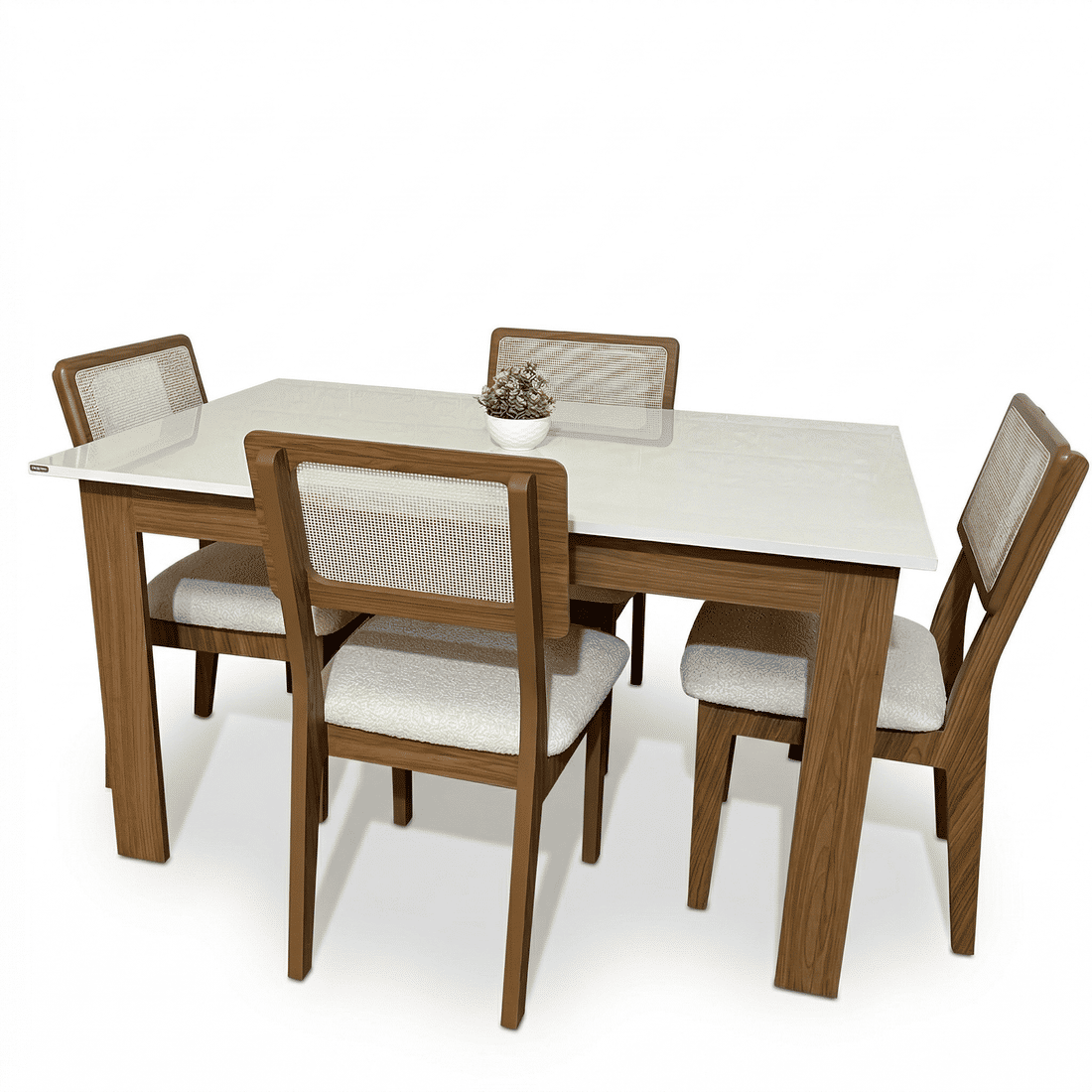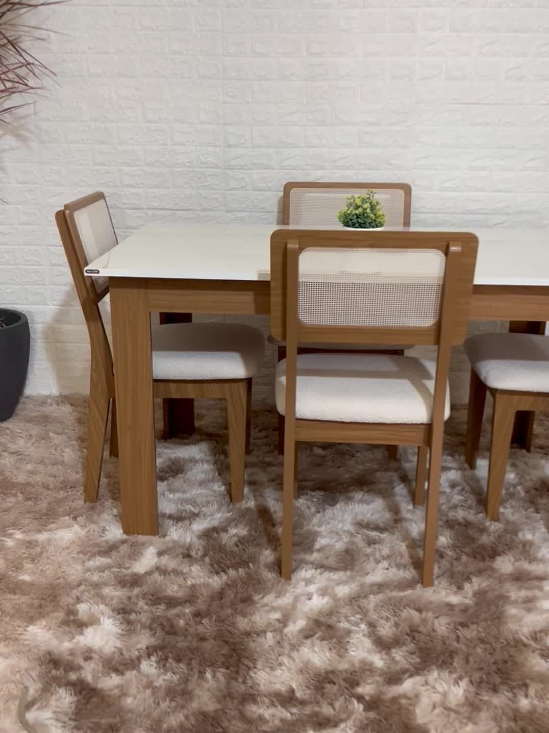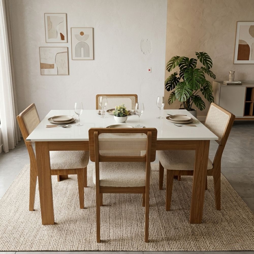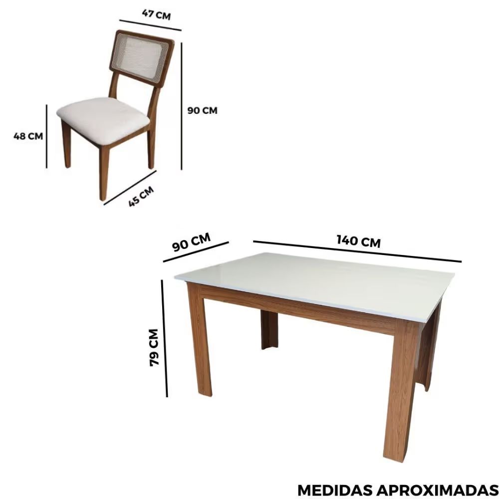 Produzido com estrutura em MDF e acabamento em pintura UV, o conjunto oferece boa durabilidade e fácil manutenção. As cadeiras com assento estofado proporcionam mais conforto, tornando o espaço mais agradável para refeições e momentos de convivência.