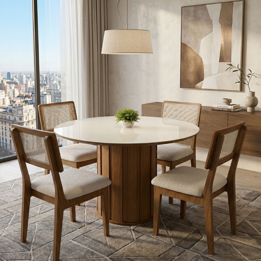 Produzido com estrutura em MDF e acabamento em pintura UV, o conjunto oferece boa resistência e durabilidade. As cadeiras com assento estofado garantem mais conforto, tornando o ambiente mais agradável para o dia a dia.