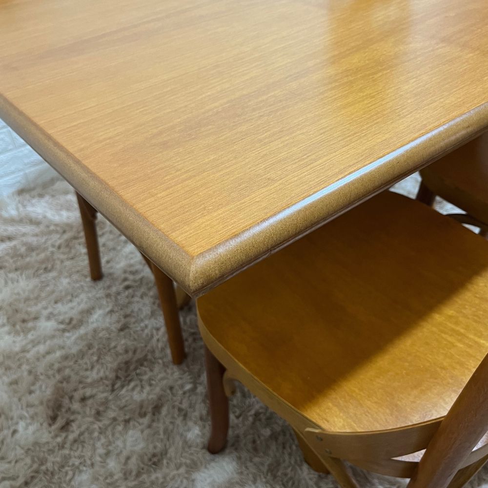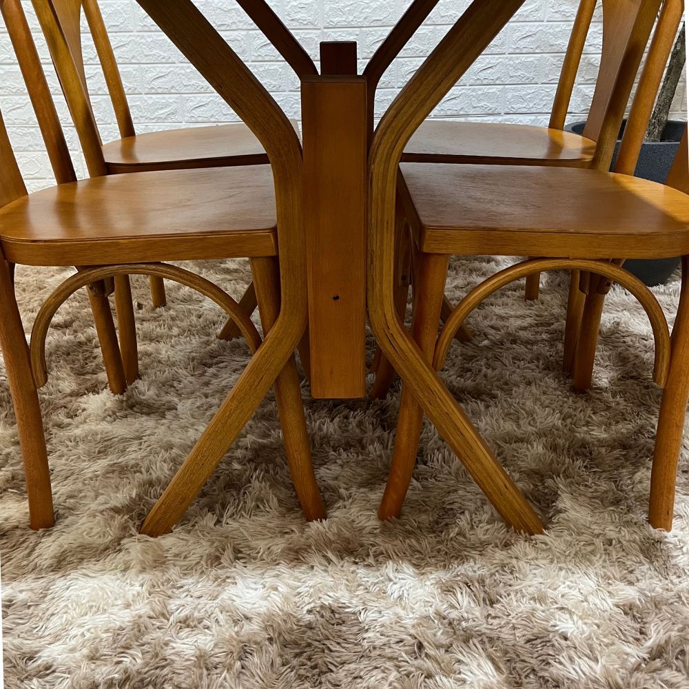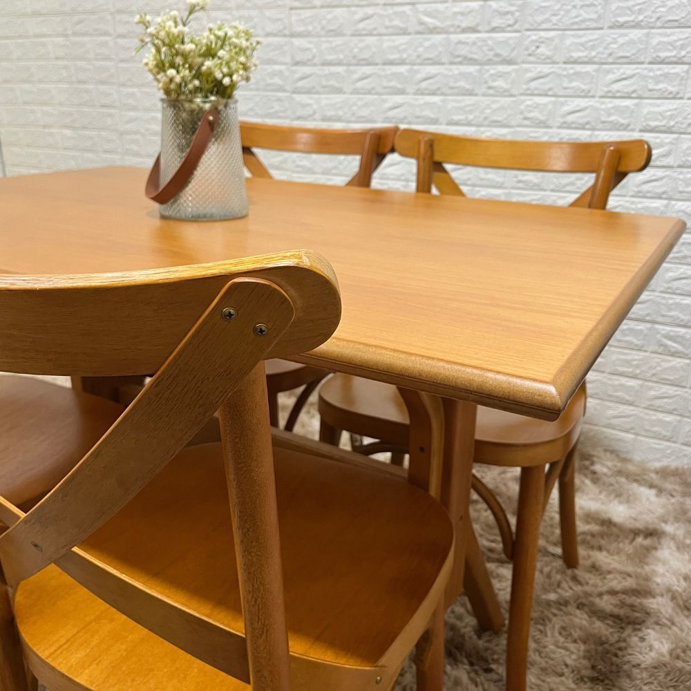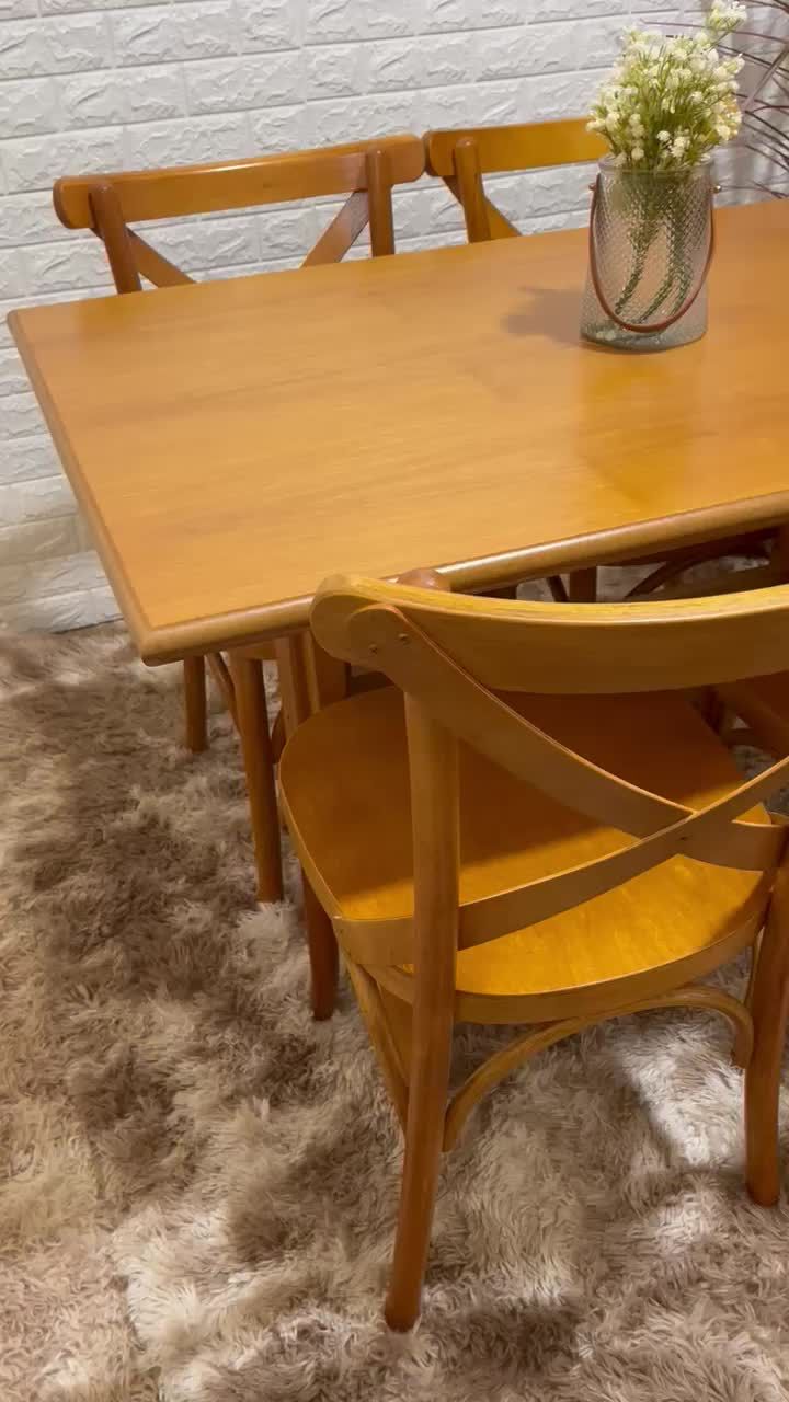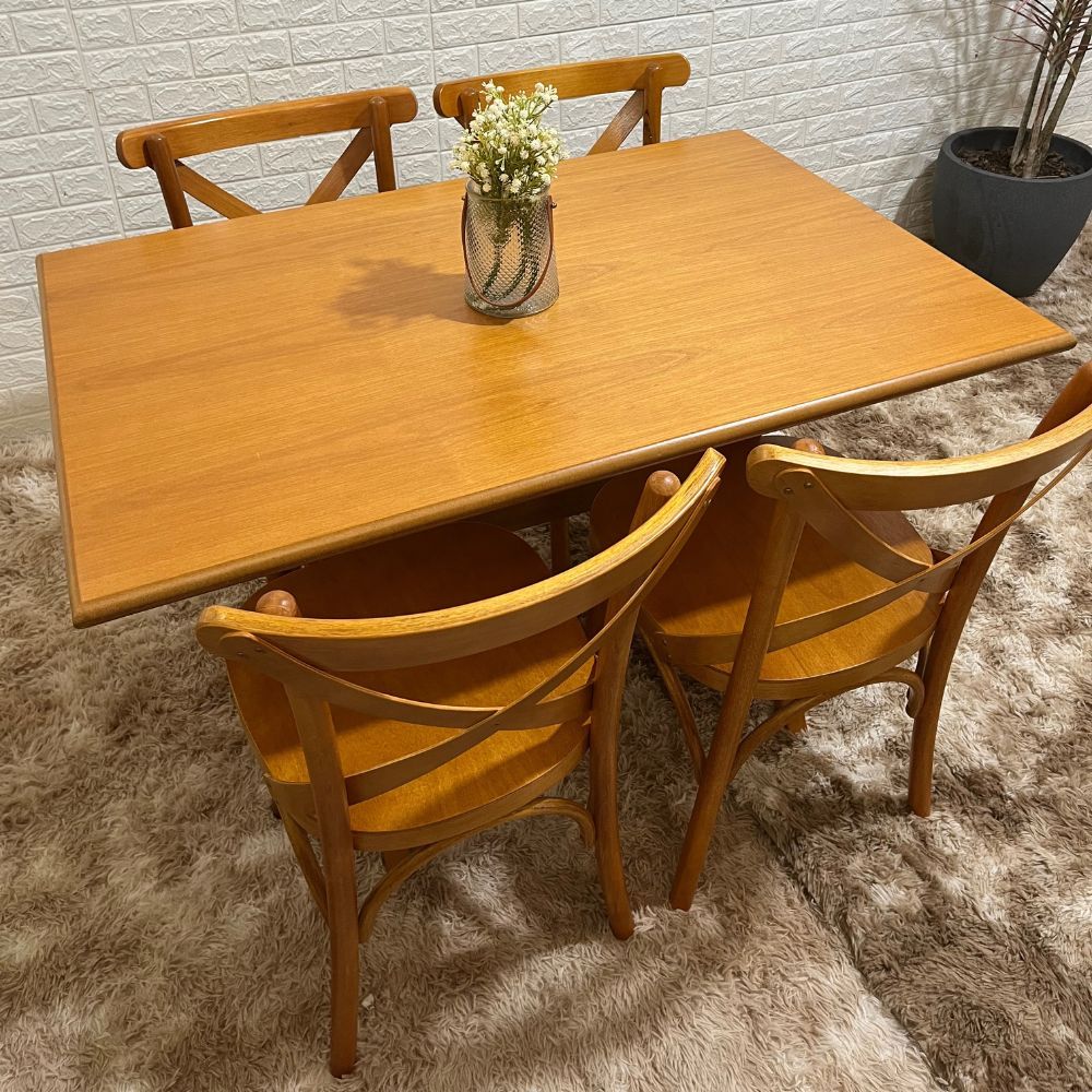 Desenvolvido para o uso frequente, o conjunto combina estrutura sólida, materiais resistentes e praticidade no uso. A mesa oferece estabilidade durante as refeições, enquanto as cadeiras proporcionam conforto e firmeza ao sentar. O acabamento em verniz reforça a proteção da madeira e contribui para a conservação das peças ao longo do tempo.