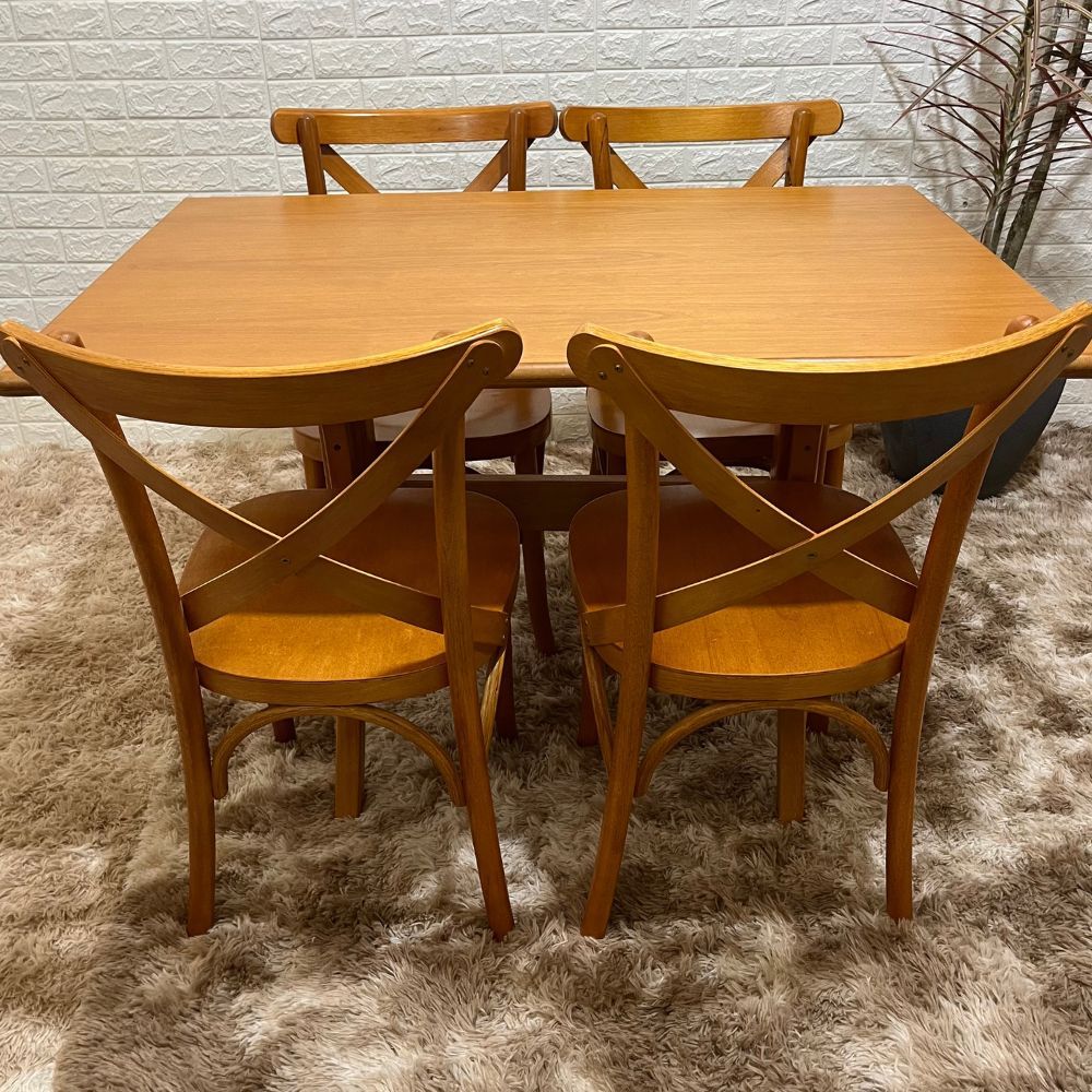 O Conjunto Mesa X 120x80 com 4 Cadeiras X é uma excelente escolha para quem busca elegância, resistência e funcionalidade para a sala de jantar, cozinha, área gourmet ou restaurantes. Produzido em madeira maciça 100% tauari, inclusive o tampo da mesa, o conjunto oferece estrutura firme, alta durabilidade e um visual sofisticado que valoriza qualquer ambiente. O acabamento em verniz contribui para maior proteção da madeira, enquanto o design da mesa com base em X e as cadeiras modelo X proporcionam conforto e estilo no uso diário.