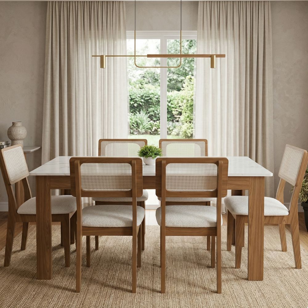 A mesa de jantar 6 lugares 160x90 é ideal para quem busca um ambiente elegante, funcional e versátil para salas de jantar, cozinhas ou áreas gourmet. Com design clean e atemporal, se adapta facilmente a diferentes estilos de decoração, sendo perfeita tanto para o dia a dia quanto para ocasiões especiais.