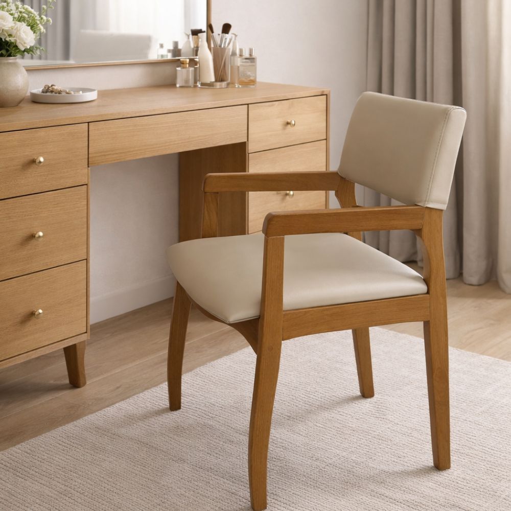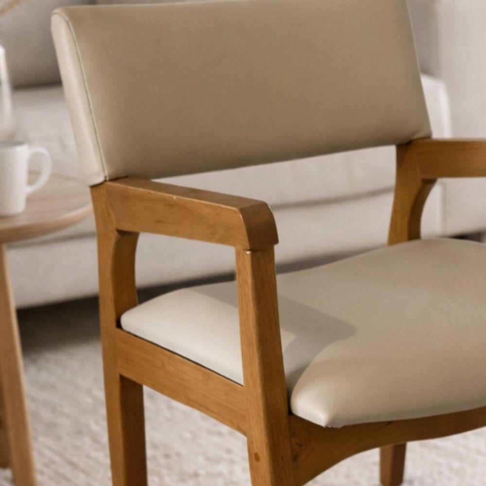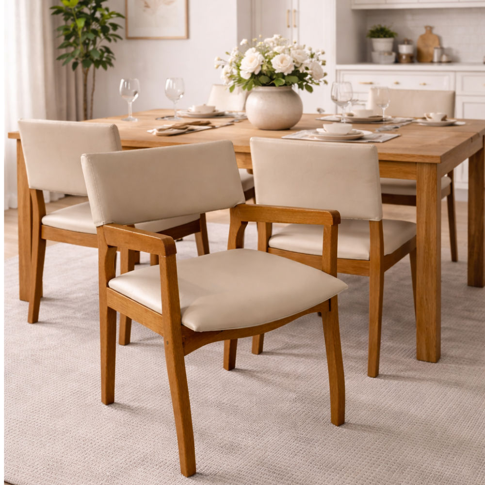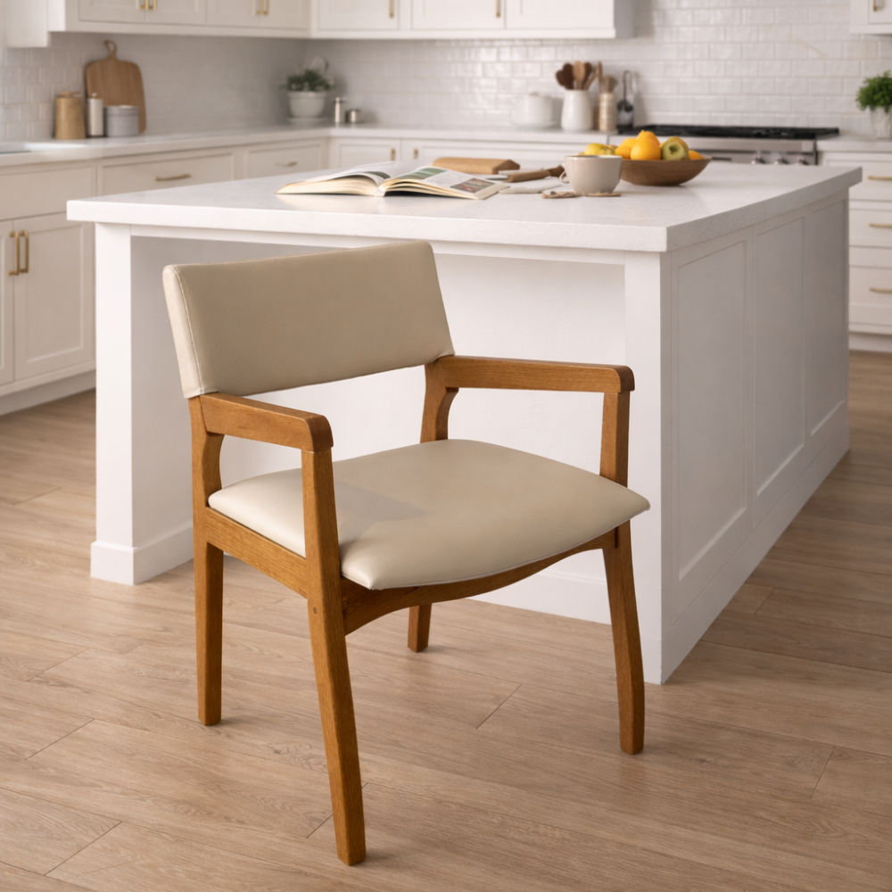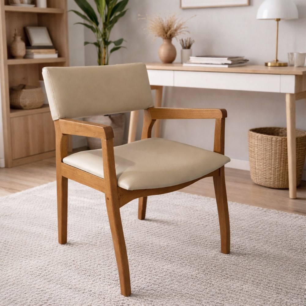 Seu assento e encosto estofados, revestidos em courino de toque suave, proporcionam maior conforto durante o uso. Os braços em madeira complementam o design, oferecendo apoio ergonômico e tornando a experiência ainda mais confortável no dia a dia.